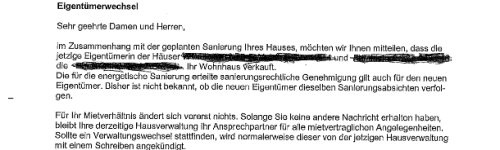 Nun hat der Eigentümer meines Wohnhauses gewechselt. Das ist an sich nichts kritikwürdiges nur erfahre ich dies nicht durch ihn oder seinem Verwalter, sondern durch die vom Bezirk beauftragte Gesellschaft, die die genehmigte energetische Sanierung des Hauses sozialverträglich und die Mieter beratend begleiten soll.