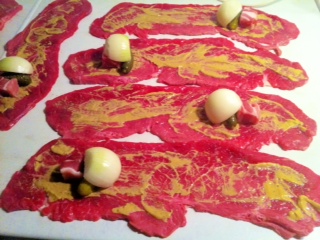 Rouladen waschen, trocknen, salzen, pfeffern, mit Senf bestreichen und mit einem Stück Speck, einer Cornichon und einer halber kleinen Zwiebel belegen. Die Scheiben rollen und mit Nähgarn zusammenbinden. Die Rouladen bei starker Hitze rundum scharf in einem Topf braun anbraten, mit Wasser oder Brühe ablöschen und auf kleiner Flamme eine Stunde köcheln lassen. Sauce nach Geschmack würzen und mit Saucenbinder andicken. Mahlzeit!