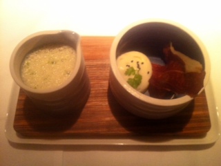 Dritter Gang: Lauchmilch mit getrocknetem Schinken