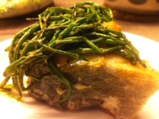Den Fisch also nicht gesalzen, gesäuert und stehen gelassen sondern nur gewaschen, trockengetupft und leicht mehliert. Dann die Koteletts, je nach Dicke zwei bis drei Minuten auf jeder Seite mit hoher Hitze angebraten, ein Stück Butter kurz vor Ende des Bratvorganges für die Verfeinerung des Geschmacks zugeben. Den Queller waschen, abtropfen lassen und mit Butter in einer Pfanne bei hoher Hitze kurz schwenken. Das Gemüse auf die Koteletts geben und mit Salzkartoffeln und Buttersößchen servieren.