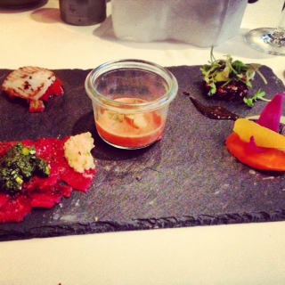 Ich entscheide mich für das Menue und die dazu passend angebotene Fränkische Weinbegleitung, die allerdings kreativ aufgebrochen werden muß, da ich keine Rotweine trinke. Das gelang famos. Die Vorspeisenvariation aus fünf Köstlichkeisten liest sich so: