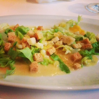 Topfen-Kräuter-Ravioli auf lauwarmen Kopfsalat, confierten Zitronen & Speck-Croûtons