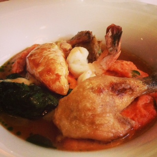 Sowohl Brüstchen als auch die Keule sind geschmacklich sehr gut und das Fleisch an der Keule läßt sich leicht ablösen. Auch die Gamba ist ein Genuß. Ein wenig irritiert bin ich von der Mousseline irgendwie paßt sie strukturell nur suboptimal in diese Komposition. Insgesamt ist der Hauptgang wunderbar.