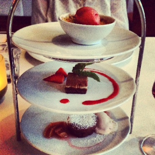 Zum Abschluß als vierter Gang das Dessert, stilvoll auf einer Étagère kredenzt finde ich folgende Leckereien von oben nach unten gesehen vor: