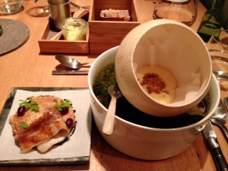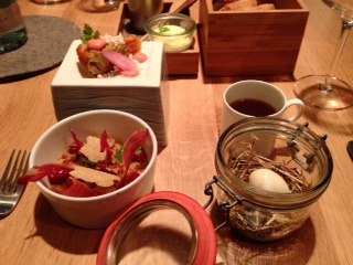 Ein lauwarmes Wachtelei im Glas und ein Zwiebelsüppchen kann ich benennen, was die beiden anderen Sachen sind vergesse ich vor Aufregung erinnere aber großartigen Geschmack. Eine sehr schöne Auswahl, die uns Lust auf mehr macht.
