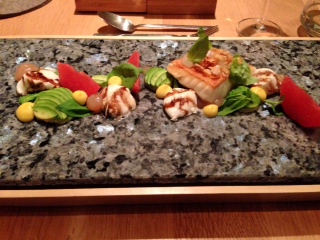 Zweiter Gang: Rochen – Krosser Rochen, Büffelmozzarella, Avocado, Grapefruit