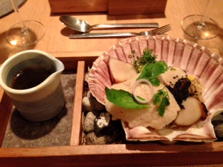 Der dritte Gang stellt mich schon vor ein Rätsel. Die Jakobsmuschel wird auf dem Spitzkohl in einer stilisierten Muschel serviert, die Entenbrühe in einem Gefäß separat. Wie also ist der Gang zu genießen? Erst den Inhalt in der Muschel aufessen und die Brühe hineingießen oder aber die Brühe gleich über den Inhalt gießen? Michael weiß natürlich eine Antwort im Sinn von „iß es wie du magst“. Ich entschließe mich zunächst den Spitzkohl zu löffeln umd dann die Entenbrühe über die Jakobsmuschel zu geben und zu löffeln. Ich kann nur sagen, grandios! Die Entenbrühe ist das Beste was ich je an „Geflügelsuppe“ gegessen habe, es ist nicht einfach eine Entenbrühe sondern DIE Entenessenz. Hut ab!
