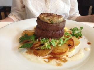 Hauptgang: Tournedo vom Sylter Gallowayrind unter der Pfefferkruste dazu junger Wirsing a la créme & Bratkartoffeln