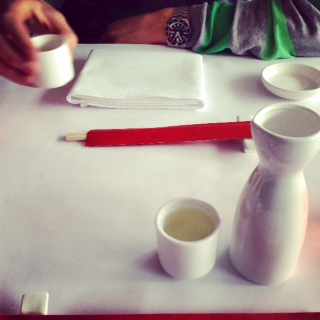 Beim Sushiladen angekommen erinnert mich das Gebäude eher an ein Barackenensemble an der Genzkontrollstelle Marienborn der DDR. (Erfahre später, das Gebäude ist als Fischhalle gebaut worden). Der Gastraum ist sehr großzügig, mit freier Sicht auf die offene Küche des Restaurants und zur Lunchzeit zu meiner Überraschung schon gut besucht. Ich studiere die Mittagskarte, sie liest sich hervorragend, tendiere zum Tunasteak „rare“ oder „blackened“ mit Tagesbeilage für ordentliche 26,50€. Allmählich dämmert mir, daß ich in einem Restaurant der gehobenen Gastronomie bin. Orientiere mich dann doch um, wir bestellen für alle neun Personen einen Sushi-Sashimi Mix mit Tempura. Also etwas, bei dem man eine interessante Variationsbreite der Küche kennenlernen kann. Als Getränk nehme ich einen heißen Sake. Der Sake ist köstlich, der Alkohol des Weins versetzt mich in eine heitere und gelassene Vorfreude auf das was da so an Köstlichkeiten kommen wird. Mein anfängliches Geknicksein ist wie weggeblasen.